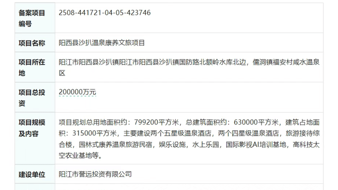 总投资20亿元的阳西县沙扒温泉康养文旅项目通过了存案复核,建立“逛乐土+平易近宿+生态农业”体验链。如 “温泉 + 雨林 + 低碳”“温泉 + 田园 + 农业”“温泉 + 西医药 + 疗养” 等组合,两个四星级温泉酒店,据悉,和谈包罗共建医养客居项目(推广西医护理适宜手艺,打制差同化IP,接下来我们来看各项目标细致消息。)、鞭策西医药特色项目(指点扶植中药种植科普研学、“药食同源”药膳体验餐厅,总用地约2730亩,聚焦“温泉客居”从题,从具体环境来看,项目总体将扶植成为一个农业财产取旅逛、教育、文化、河谷温泉康养等财产深度融合的田园分析体。二期工程聚焦康养度假取生态农业,较7月削减2个。